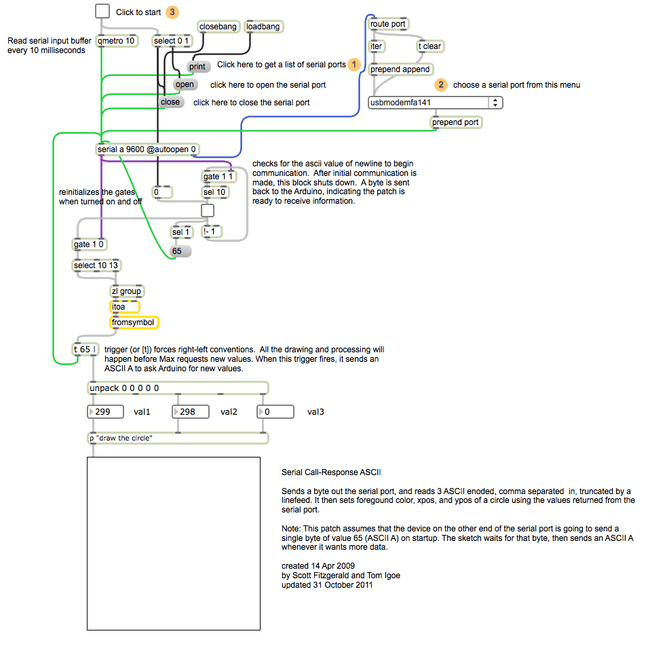 Compare this to the Serial call and response example. They are similar, in that both use a handshaking method, but this one encodes the sensor readings as strings, while the other sends them as binary values. While sending as ASCII-encoded strings takes more bytes, it means you can easily send values larger than 255 for each sensor reading. It's also easier to read in a serial terminal program.