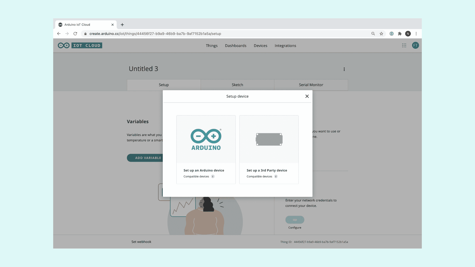 We need to connect the Arduino Nano 33 IoT to the computer and make sure that the IoT Cloud recognizes it by clicking on the Select Device button on the device field of the thing. A pop up window will appear, asking you to configure either an Arduino device, or an ESP device. Here, we will choose the Set up an Arduino device option.